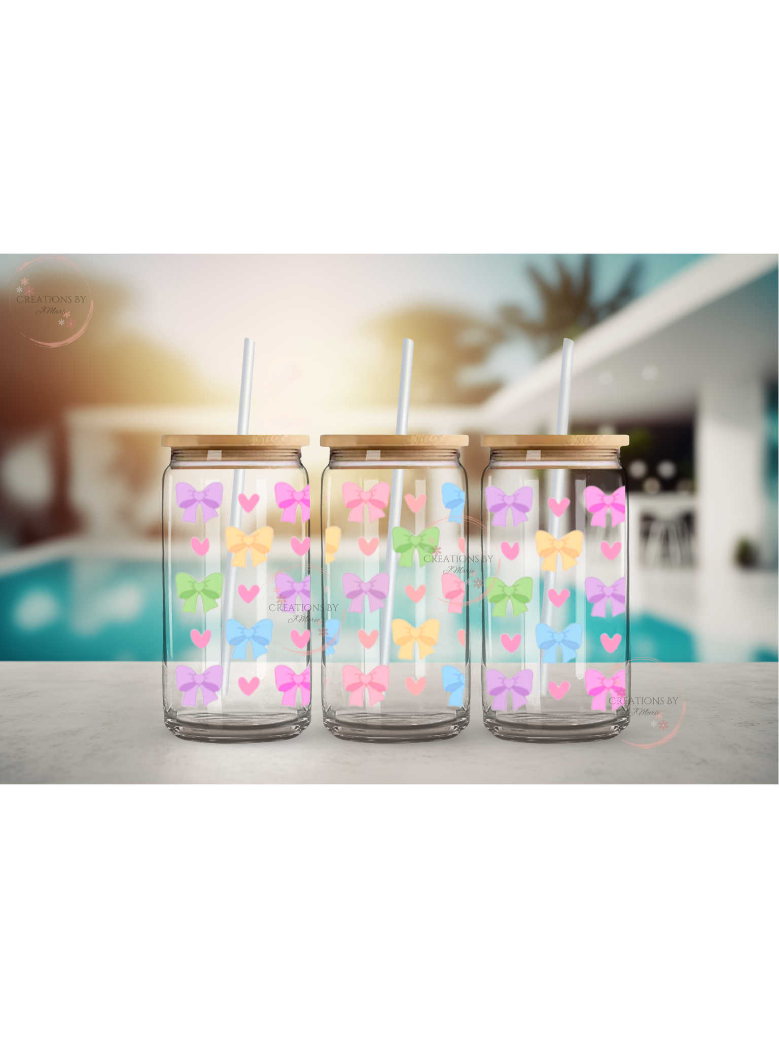 This 16oz glass cup showcases a playful bow pattern in bright, cheerful colors, combining functionality with a lively design. Crafted for everyday use, it adds a touch of charm to your drinkware collection while providing a comfortable grip and ample capacity for your favorite beverages.